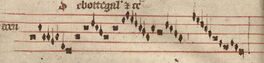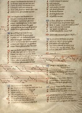 Hoewel lyriek in de middeleeuwen meestal gezongen werd, krijgen we voor het Nederlands pas omstreeks 1400, met het Brugse Gruuthuseliedboek, voor het eerst muziek te zien. Geen noten weliswaar, maar streepjes op een sleutelloze notenbalk los boven de tekst. Musicologen en musici hebben er tot op de dag van vandaag een lastige dobber aan.
